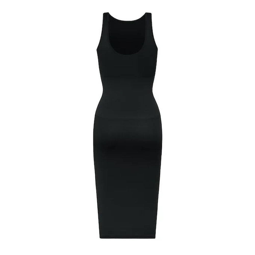 This Bodycon Shaper Dress is designed to provide a comfortable and flattering fit for your body, with a removable pads and a waist-clinching design. The dress is meant to stretch below the knee, offering a slimming effect.